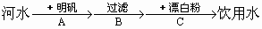 我国南方饮用水大多为河水.由于河水中含有较多的泥沙、悬浮物、细菌等.在将河水用做饮用水之前需经下面A、B、C三步处理: