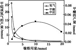 反应结束后,气体中检测到CH4和H2,滤液中检测到HCOOH,固体中检测到镍粉和Fe3O4.CH4、HCOOH、H2的产量和镍粉用量的关系如图所示(仅改变镍粉用量,其他条件不变):