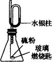 如图所示装置,待内外空气压强不变时标注出水银液面的刻度(用红漆).取下橡皮塞,在玻璃燃烧匙中加入硫粉,用酒精灯点燃后迅速移入锥形瓶中并塞紧橡皮塞.硫粉安静地燃烧,水银柱移向左管.当火焰熄灭后,静置,水银柱又慢慢地回到原先标注的刻度.简要回答下列问题: