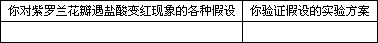 著名化学家罗伯特·波义耳(Robert Boyle)在一次实验中,不小心将盐酸溅到紫罗兰花瓣上,过了一会儿,他惊奇地发现,紫色的花瓣上出现了红点.波义耳对这一意外的发现作出了多种假设,经过多次实验验证,探究普遍规律,终于获得了成功.对紫罗兰花瓣遇盐酸变红的现象,你有哪些假设?请将你的各种假设以及验证假设的实验方案填写在下表中.