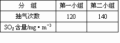 该学生课外活动小组分成第一小组和第二小组,使用相同的实验装置和溶液A,在同一地点、同时测量空气中SO2的含量.当反应恰好完全进行,记录抽气次数如下(假设每次抽气500 ml),请将下表填写完整(计算时保留2位有效数字):