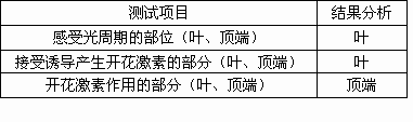 (2)根据B、C实验,填写实验报告表中的有关内容测试项目结果分析感受光周期的部位(叶、顶端)接受诱导产生开花激素的部分(叶、顶端)开花激素作用的部分(叶、顶端)。