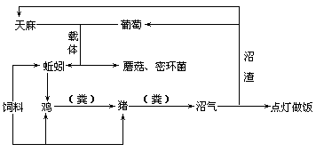¡¡¡¡£¨1£©ÌìÂé¡¢ÆÏÌÑ,òÇò¾¡¢¼¦¡¢Öí,ÃÜ»·¾ú¡¢Ä¢¹½ ¡¡¡¡£¨2£©ÎïÖÊ,ÄÜÁ¿,ÎïÖÊ,ÄÜÁ¿ ¡¡¡¡£¨3£©¼òͼÈçͼËùʾ£º