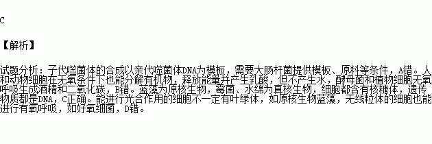 D.能进行光合作用的细胞不一定有叶绿体,无线粒体的细胞只能进行无氧呼吸