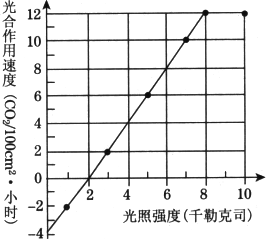 在一定浓度的CO2和适当的温度条件下,测定某双子叶植物叶片在不同光照条件下的光合作用速度(以CO2 mg/100 cm2叶/小时表示),结果如下表。表中负值表示二氧化碳释放量,正值表示二氧化碳吸收量。