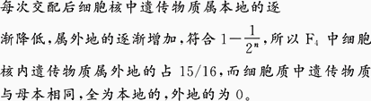 在引进优良家畜(如牛、羊)时一般引进雄性个体,让其与本地的同种雌性个体杂交,考虑到经济与遗传方面的因素,一般以引进4头雄性家畜为宜,具体做法是:让一头引种雄畜与一头本地种雌性个体杂交得F1,F1中的雌性个体与第二头引种雄畜相交得F2,F2中的雌性个体与第三头引种雄畜相交得F3,F3中的雌性个体与第四头引种雄畜相交得F4,试问F4个体中,细胞核内和细胞质内的遗传物质属外地种的约有多少
