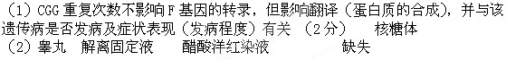 (7分)(1)人类的F基因前段存在CGG重复序列。科学家对CGG重复次数、F基因表达和某遗传病症状表现三者之间的关系进行调查研究,统计结果如下: