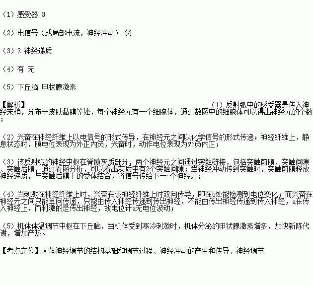 (3)该反射弧的神经中枢中含有 个突触。当神经冲动传到突触时,突触前膜释放 ,与突触后膜上的受体结合,将信号传给下一