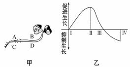 甲图为横放在地面上的植物的生长状况,乙图为植物生长素浓度对植物生长的影响曲线。试分析甲图中C部位和D部位的生长素浓度分别相当于乙图中的哪一区间