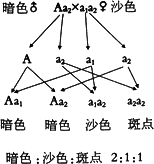控制狗的皮毛中色素分布的等位基因有三个,分别是A和a1、a2(显性的顺序是A>a1>a2)。基因A使暗色素在全身均匀分布;基因a1降低了色素的沉积程度,产生沙色的狗;基因a2产生斑点形式。根据下图分析回答: