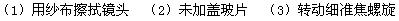 某学生在实验时,先用一块洁净的纱布擦拭镜头,再在一干净载玻片中央滴一滴清水,放入一小块植物组织切片,小心展平后放在显微镜载物台正中央,并用弹簧片压住。然后在双眼侧视下,将物镜降至距玻片2-3cm处停止。用左眼朝目镜里观察,同时转动细准焦螺旋,缓缓上升镜筒。请指出3处该生操作中不正确的地方: