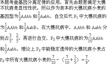 某育种专家在农田中发现一株大穗不抗病的小麦,自花授粉后获得160粒种子,这些种子发育成的小麦中有30株大穗抗病和若干株小穗抗病,其余的都不抗病。若将这30株大穗抗病的小麦作为亲本自交,在其F1中选择大穗抗病的再进行自交,理论上F2中能稳定遗传的大穗抗病小麦占F2中所有大穗抗病小麦的