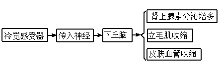 ( 1)寒冷,立毛肌收缩、汗液分泌少、皮肤血管收缩、皮肤血管收缩( 2)增加,骨骼肌不自主战栗( 3)收缩,分泌,减少,热量散失( 4)( 5)肾上腺素,甲状腺激素( 6)神经调节和体液 |