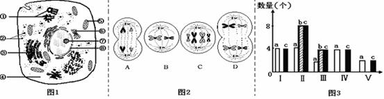 下图1是某高等动物细胞的亚显微结构模式图,图2是该种雄性动物的不同细胞分裂示意图,图3表示图2细胞分裂过程中不同时期细胞内染色体、染色单体和DNA含量的关系。