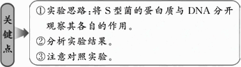 自主解答:注入小白鼠体内的是R型菌,结果从死亡小白鼠体内能分离出S型菌,说明R型菌可以转化为S型菌。但无法得知S型菌能否转化为R型菌。S型菌的蛋白质与R型菌混合注入小白鼠体内,结果小白鼠不死亡,未分离出S型菌,说明S型菌的蛋白质外壳不能诱导R型菌转化为S型菌。S型菌的DNA与R型菌混合注入小白鼠体内,结果小白鼠死亡,并分离出了S型菌,说明S型菌的DNA可诱导R型菌转化为S型菌,从而证明了DNA是遗传物质。使小白鼠死亡的不是S型菌的DNA,而是转化产生的S型菌。 |