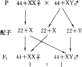 答案:见讲解。 讲解:人的体细胞中,有46条染色体,可配成23对,其中22对在男性和女性中是一样的。另外一对是性染色体,在女性中成对,叫做X染色体,而在男性中,X染色体只有一个,与另外一个很小的Y染色体成对。经减数分裂形成配子时,男性可产生两种精子,一种精子含22条常染色体和一条X染色体,另一种精子具有22条常染色体和一条Y染色体。这就是说两种精子是22+X和22+Y,且数目相等。而女性只能产生一种卵细胞即22+X。带有X染色体的卵细胞与带有X染色体的精子结合(受精),得到XX合子,发育成女性;带有X染色体的卵细胞与带有Y染色体的精子结合,得到XY合子,发育成男性(如下图)。