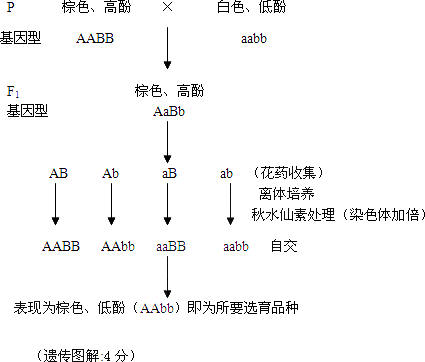 (3)棕色棉抗虫能力强,低酚棉产量高。为获得抗虫高产棉花新品种,研究人员将诱变I代中棕色、高酚植株自交。每株自交后代种植在一个单独的区域,从________的区域中得到纯合棕色、高酚植株。请你利用该纯合体作为一个亲本,再从诱变I代中选择另一个亲本,涉及一方案,尽快选育出抗虫高产(棕色、低酚)的纯合棉花新品种(用遗传图解表示)。