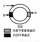 质粒是基因工程中最常用的运载体。质粒上有标记基因如图所示,通过标记基因可以推知外源基因(目的基因)是否转移成功。外源基因插入的位置不同,细菌在培养基上的生长情况也不同,下表是外源基因插入位置(插入点有a、b、c),请根据表中提供细菌的生长情况,推测①②③三种重组后细菌的外源基因插入点,正确的一组是: