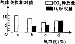 图中表示某植物的非绿色器官在氧浓度为a、b、c、d时,CO2释放量和O2吸收量的变化。下列相关叙述正确的是
