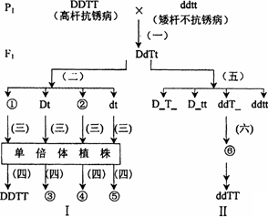 现有两个小麦品种,一个纯种小麦性状是高杆(D),抗锈病(T);另一个纯种小麦的性状是矮杆(D,易染锈病(t).两对基因独立遗传.育种专家提出了如下图所示的Ⅰ、Ⅱ两种育种方法以获得小麦新品种.问: