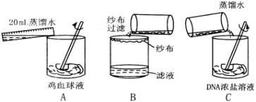 分别在A、B、 C三个研钵中加2克剪碎的新鲜菠菜绿叶,并按下表所示添加试剂,经研磨、过滤,得到三种不同颜色的溶液,即:深绿色、黄绿色(或褐色)、几乎无色。
