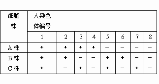 将分离出的杂种细胞在不同条件下继续培养,获得A、B、C三细胞株.各细胞株内含有的人染色体如有表("+"有,"-"无)测定各细胞株中人体所具有的五种酶的活性.结果是:①B株有a酶活性;②A、B、C株均有b酶活性:③A、B株有c酶活性;④C株有d酶活性;⑤A、B、C株均无e酶活性.若人基因的作用不受鼠基因影响,则支配a、b、c、d和e酶合成的基因依次位于人的________、________、________、________和________号染色体上.