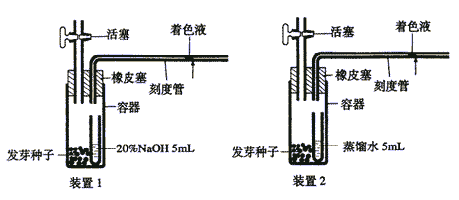 关闭活塞,在25℃下经20分钟读出刻度管中着色液移动距离.设装置1和装置2的着色液分别向左移动x和y(mm).x和y值反映了容器内气体体积的减少.请回答: