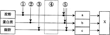 下图为人体消化与吸收过程示意图。①~⑤表示消化液,其中⑤是小肠液。纵向箭头表示消化液对相应化合物的消化作用,a~c表示淀粉、蛋白质和脂肪的最终消化产物。请回答下列问题。