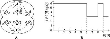 下列图A是某基因组成为AaBbdd的雌性高等动物细胞分裂过程中某时期的染色体和基因示意图(●和○表示着丝点,1表示的染色体是X染色体),图B是该生物配子形成过程中细胞内染色体数变化的曲线图。请据图回答: