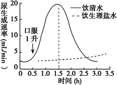 下图中曲线表示某健康成年人分别饮1升清水及饮1升生理盐水后的尿生成速率。错误的叙述是