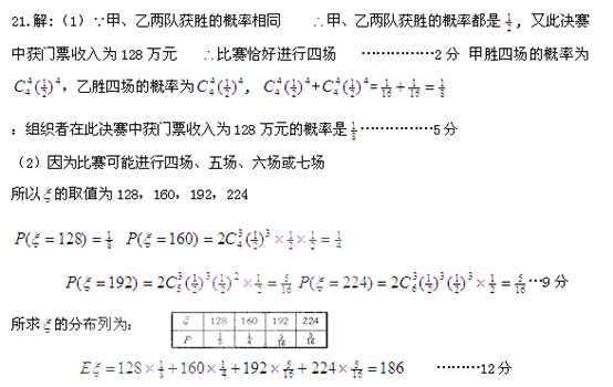 某篮球联赛的总决赛在甲、乙两队之间角逐。采用七场四胜制,即有一队胜四场,则此队获胜,同时比赛结束。在每场比赛中,两队获胜的概率相等。根据以往资料统计,每场比赛组织者可获门票收入32万元,两队决出胜负后,问: