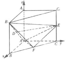 解法二:以A为原点,以射线:AB、AC、AA1分别为x、y、z的正半轴建立空间直角坐标系,设AB=AA1=AC=2a>0,可知各点坐标分别为A(0,0,0),B(2a,0,0),C(0,2a,0),B,(2a,0,2a),E(0,2a,a),F(a,a,0),D(a,0,a)
