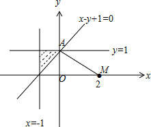 解答 解:由约束条件$\left\{\begin{array}{l}{x-y+1≤0}\\{y≤1}\\{x>-1}\end{array}\right.$作出可行域如图,![]()