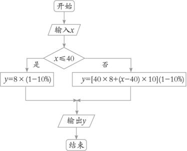 国家法定工作日内,每周工作时间满工作量为40小时,每小时工资8元;如需要加班,则每小时工资为10元.某公务员在一周内工作时间为x小时,但他须交纳个人住房公积金和失业保险(这两项费用为每周总收入的10%).试画出其净得工资y元的算法的程序框图.(注:满工作量外的工作时间为加班)