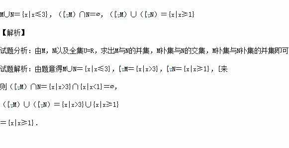 已知全集U=R,集合M={x|x≤3},N={x|x<1},求M∪N,(∁UM)∩N,(∁UM)∪(∁UN)