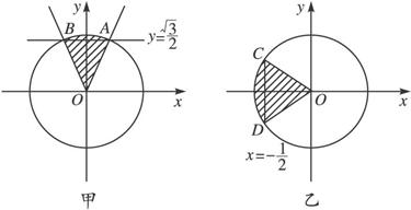 交单位圆于A、B两点,连结OA、OB.则OA与OB围成的区域(图甲中阴影部分)即为角α的终边范围.故满足条件sinα≥