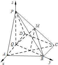 (2)确定PQ⊥平面ABCD,建立空间直角坐标系,求出$\overrightarrow{AP}=(-1,0,\sqrt{3}),\overrightarrow{BM}=(-\frac{6}{7},-\frac{{\sqrt{3}}}{7},\frac{{\sqrt{3}}}{7})$,利用向量的夹角公式求异面直线AP与BM所成角的余弦值;