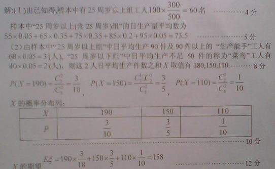 (2) 若“25周岁以上组”中日平均生产90件及90件以上的称为“生产能手”; “25周岁以下组”中日平均生产不足60件的称为“菜鸟”。从样本中的“生产能手”和”菜鸟”中任意抽取2人,求这2人日平均生产件数之和X的分布列及期望。(“生产能手”日平均生产件数视为95件,“菜鸟”日平均生产件数视为55件)。