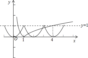 分析:由题意可得函数的周期等于2,在同一个坐标系中,画出函数y=f(x)与函数y=|log4x|的图象,求出y=f(x)的图象与函数y=|log4x|的图象的交点个数,即得所求.