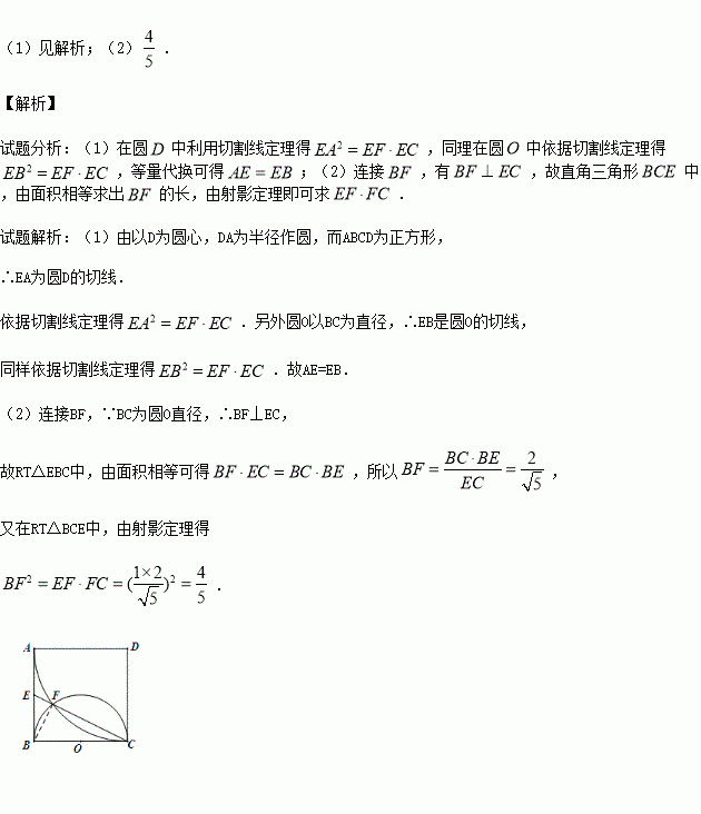 如图,正方形ABCD边长为2,以D为圆心,DA为半径的圆弧与以BC为直径的半圆O交于点F,连接CF并延长交AB于点E.