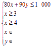 某个电脑用户计划使用不超过1 000元的资金购买单价分别为80元、90元的单片软件和盒装磁盘.根据需要,软件至少买3片,磁盘至少买4盒,写出满足上述所有不等关系的不等式.
