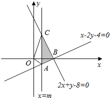 解答 解:由约束条件$\left\{\begin{array}{l}x-2y-4≤0\\ 2x+y-8≤0\\ x≥m\end{array}$作出可行域如图,![]()