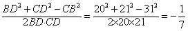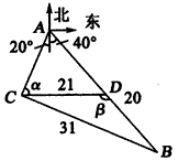 某观测站C在城A的南偏西20°的方向,由城A出发的一条公路,走向是南偏东40°,在C处测得公路上B处有一人,距C为31千米,正沿公路向A城走去,走了20千米后到达D处,此时CD间的距离为21千米,问:这人还要走多少千米才能到达A城?