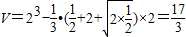 【答案】分析:由已知三视图我们可以判断出该几何体为一个正方体截去一个三棱台,根据已知中正方体的棱长为2,我们根据三视图中所标识的数据,分别计算出正方体的体积和三棱台的体积,进而可以求出该几何体的体积.