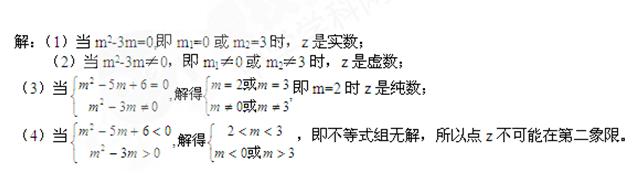 (本小题13分)实数m取什么值时,复数z=(m2-5m+6)+(m2-3m)是(1)实数?(2)虚数?(3)纯虚数?(4)表示复数z的点在第二象限?