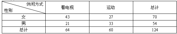 在对人们的休闲方式的一次调查中,共调查了124人,其中女性70人,男性54人.女性中有43人主要的休闲方式是看电视,另外27人主要的休闲方式是运动;男性中有21人主要的休闲方式是看电视,另外33人主要的休闲方式是运动.