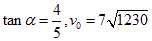若不计空气阻力,炮弹运行轨道是抛物线.现测得我炮位A与炮击目标B在同一水平线上,水平距离为6000米,炮弹运行的最大高度为1200米.试求炮弹的发射角α的正切值和发射初速度v0(重力加速度g=9.8米/秒2).