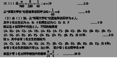(Ⅱ)若从“诗雨文学社”社团抽取的同学中选出2人担任该社团正、副社长的职务,已知 “诗雨文学社”社团被抽取的同学中有2名女生,求至少有1名女同学被选为正、副社长的概率.