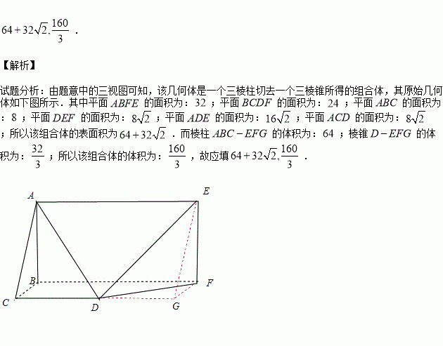 已知某几何体的三视图如下图所示,其正视图为矩形,侧视图为等腰直角三角形,俯视图为直角梯形.则该几何体的表面积是 ;体积是 .