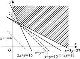 )附近所有整点,接着平移直线l:x+y=0,会发现当平移至B(4,8)、C(3,9)时直线与原点的距离最近,即z的最小值为12.
